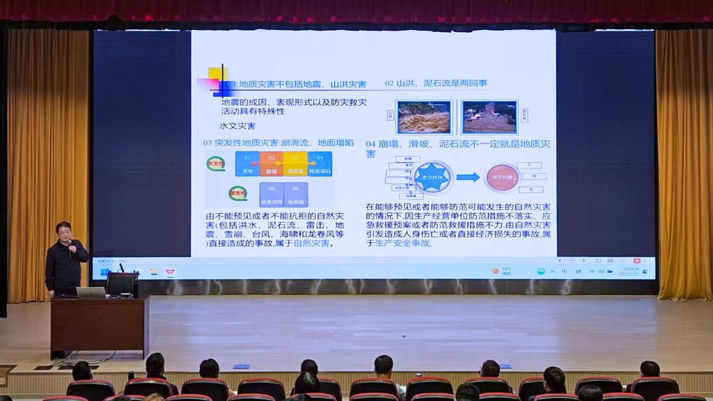 吴琦教授以《地质灾害类型介绍及预防、处理方法》为题作专题讲座,他从国家政策法规、国家标准等层面详细阐述了地质灾害预防、处理工作现状,并且以具体案例详细介绍了地质灾害预防、处理的方法和技术。吴琦教授讲座精彩纷呈,赢得了来自河南省地质局的学员们的阵阵掌声,并与学员代表进行了互动交流。