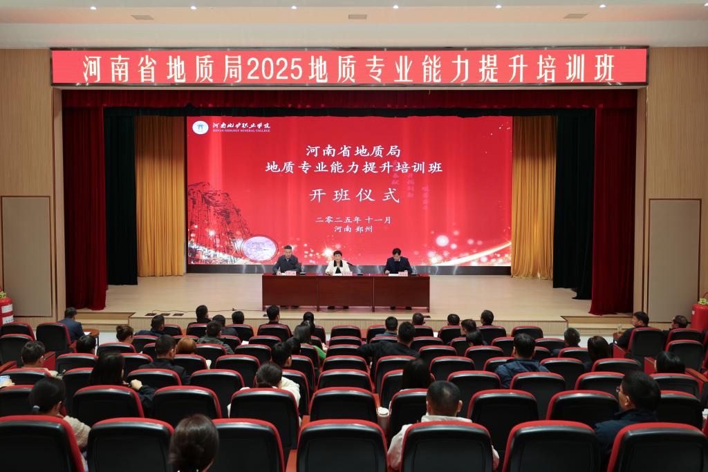 11月4日,河南省地质局2025地质专业能力提升培训班开班仪式在我校勤奋楼报告厅成功举办,河南省地质局党组成员、副局长、一级巡视员陈彦召,我校党委书记焦洪涛出席会议并讲话,河南省地质局二级巡视员台本华、二级巡视员柏峰出席会议,河南省地质局机关和直属单位的负责人及我校地矿工程学院和继续教育中心负责人参加会议。开班仪式由副校长冯敏主持。